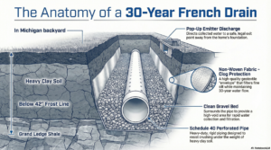 A professionally installed French drain in Mid-Michigan typically lasts 20 to 30 years, provided it uses non-woven geotextile fabric and is buried below the 42-inch frost line.